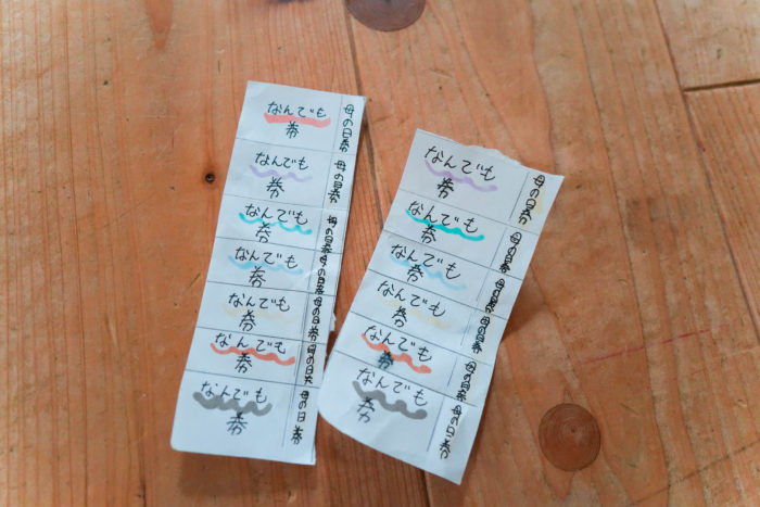 今更ですが、母の日にもらったもの。長女からは『なんでも券』切り取りミシン目も入っており結構手の込んだなんでも券ですが、さっそく1枚目使った内容は、『自分の部屋をかだづけてこい』でした(笑)