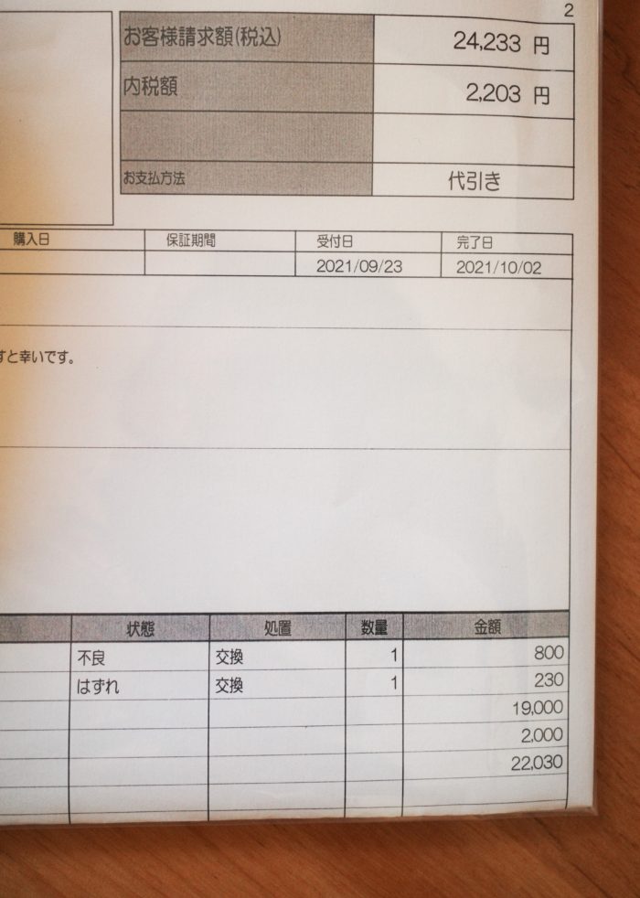 前回、車で公園にピクニックに行ったとき、コンクリートの上に落としてファインダーが映らなくなってしまったα7ⅲさんですが、20日の日に電話して22日には引き取りの業者の人が段ボールを持って回収してくださいました、見積もりはだいたい23000円以上と記入してありましたが、それより安かった場合は見積もり連絡なしに修理が続行するらしいです。私は安くても高くてもとりあえず見積もりだけ連絡してもらい修理はぜったいにしてほしかったため備考欄に見積もり連絡欲しいと記載したのですが、一向にお電話がかかってこず10月の1日くらいにSONYにお電話したのですが23分経っても電話はつながらず、やっとつながった~と。おもいましたら『修理担当者がみなほかの対応をしておりつなげないため明日折り返電話させていただきます』とのことで、次の日連絡来るのを待っていたら、連絡より先に見積書がメールが、送られてきました。とりあえず電話欲しいっていったのになぁとおもいながら電話をするとちゃんと応対してくださり、見積金額は、もう変更がないないのかや、修理どれくらいで戻ってくるかと、修理をそのまま継続してくださいとお伝えし、スムーズに今回の電話は終わりました。