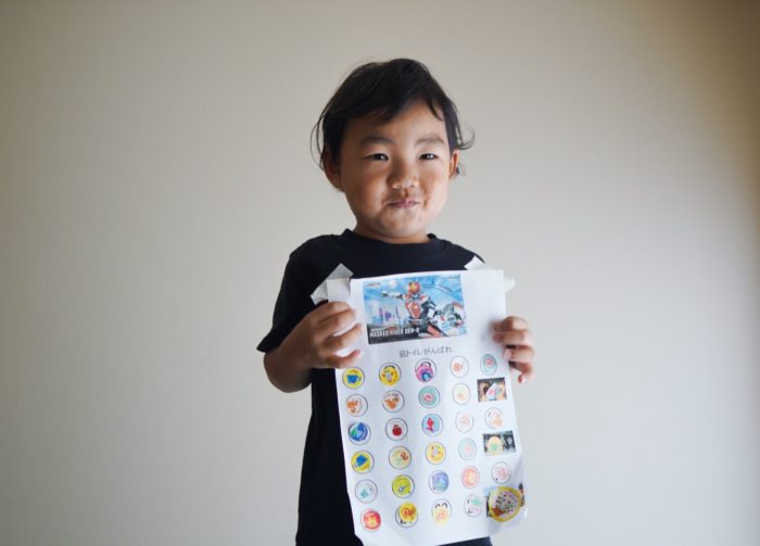 ちょっと恥ずかしそうにトイレシールシートがたまったので記念撮影。 わたしがオリジナルで作った仮面ライダー電王のトイレシールシートでございます。