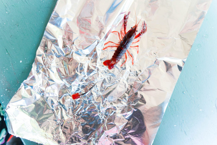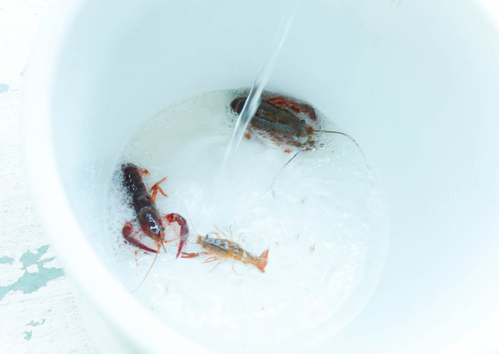 捕まえたザリガニは3びきだけで1匹はたくさんの生まれたての赤ちゃんがおり、なんだかこれを食べるのかと思うと余計に気がひけますが